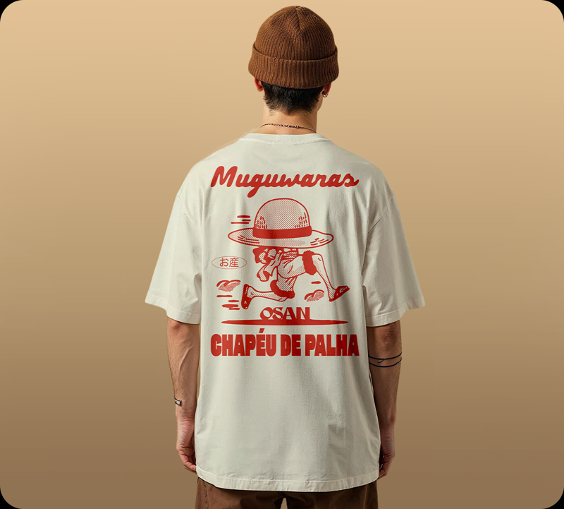 Uma estampa que puxa direto daquela energia que só quem cresceu com o pirata do sorriso impossível entende. O Luffy aparece correndo como se tivesse acabado de sair de uma abertura clássica. O corpo pequeno, leve, quase pulando do traço, enquanto o chapéu de palha cresce num exagero proposital, enorme, quase maior que a cena inteira. É o símbolo máximo da jornada, do sonho, da teimosia bonita de não desistir nunca. O lettering “Mugiwaras” entra como quem chama pelo bando, do jeito que o fã fala sem pensar, porque já virou idioma próprio. A OSAN pega essa memória e transforma em impacto visual: tipão gigante, tela chapada vermelha, textura graficona que parece saída de um mangá antigo, com aquela granulação que dá vida. A peça acompanha essa energia. A Camiseta Oversized Fio 30 é feita em 100% algodão, com modelagem quadrada, gola canelada 2x1 e um caimento amplo que traz conforto e presença. Um visual moderno, despojado, com aquela atitude urbana que combina com quem usa anime como idioma. É peça de quem carrega o chapéu também, mesmo sem vestir um. É para quem veste história, não tendência.